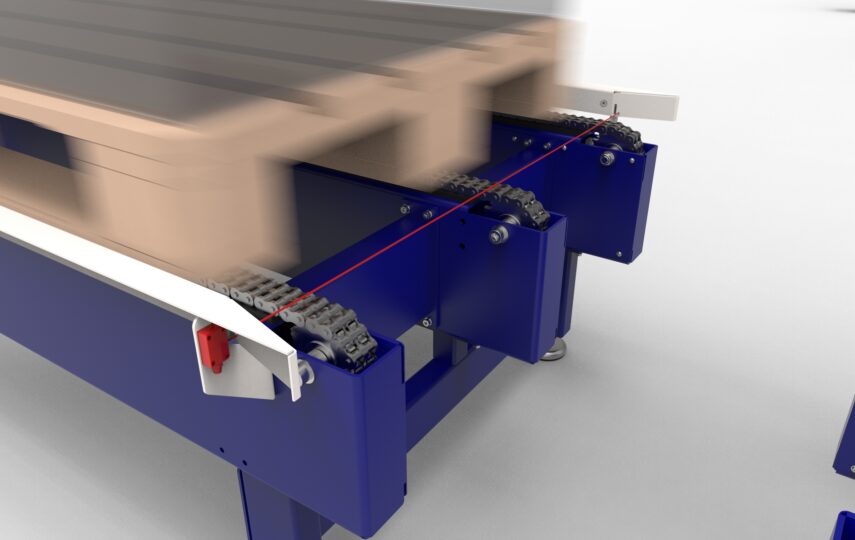 Steel frame based chain conveyor design to carry heavy loads. Conveyor with 2 or 3 chain runs is available (3 chain runs recommended for products over 800kg). Accessories side guides, sensors, pneumatic pushers, end stoppers are available.