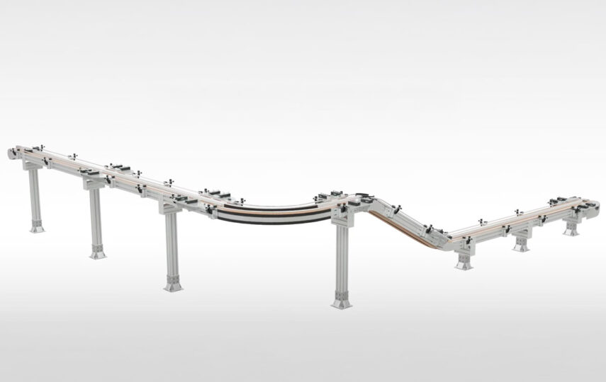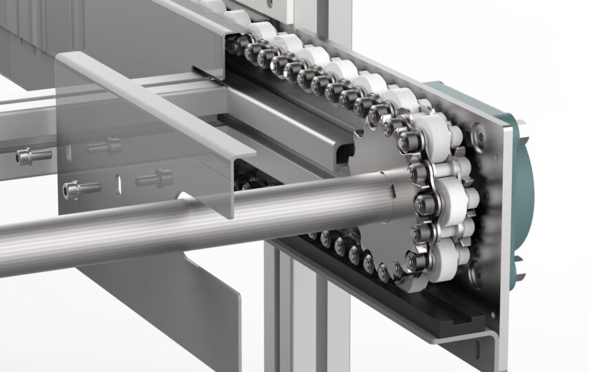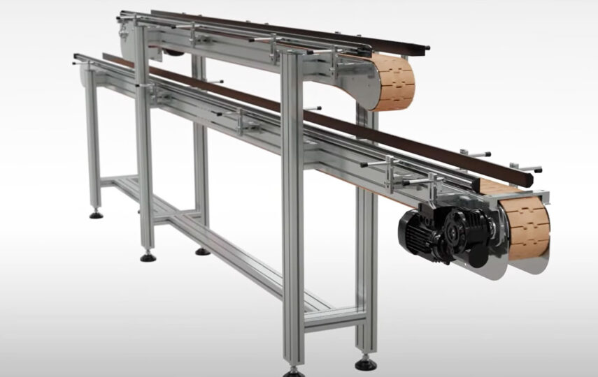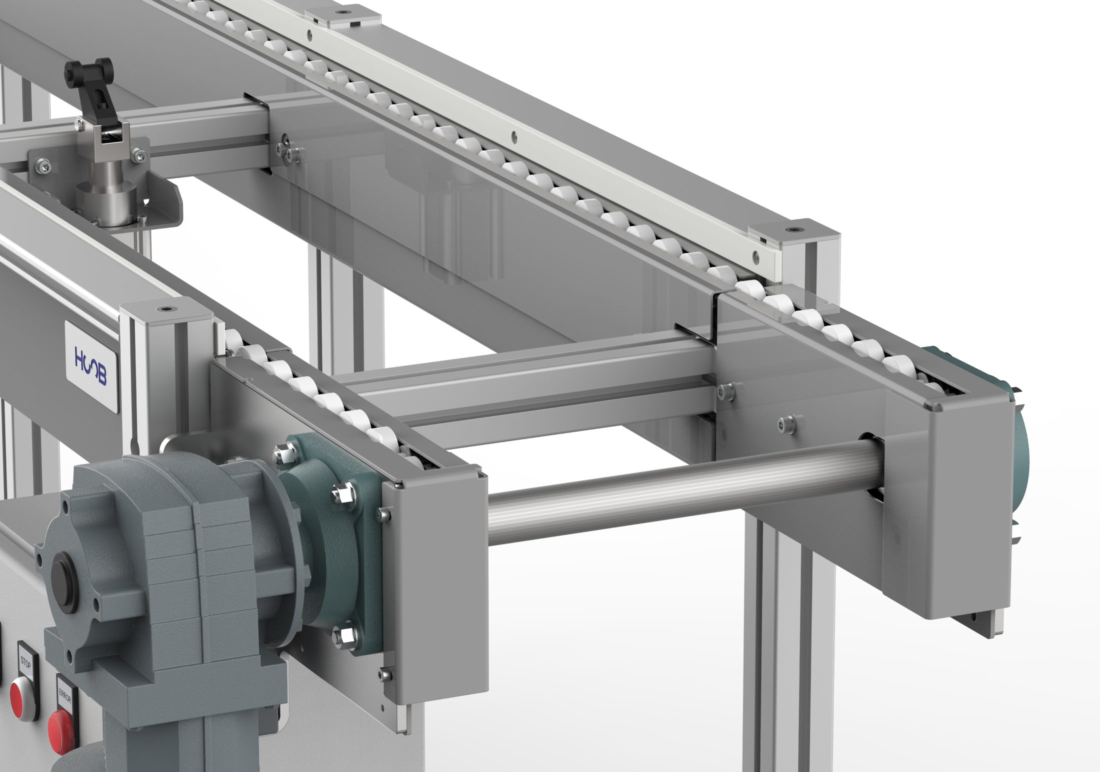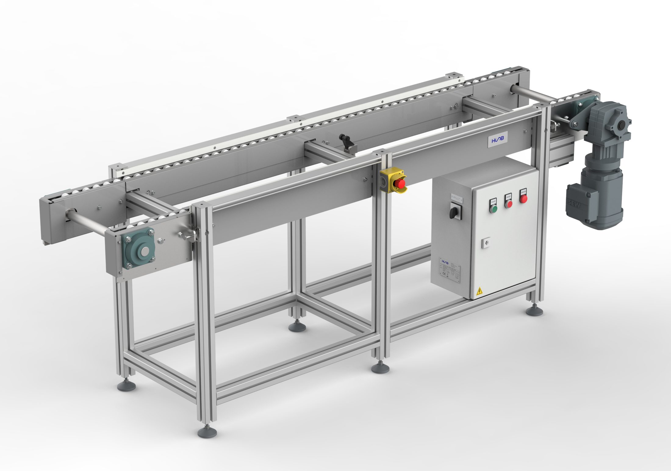 Chain conveyor based on aluminum frame for low and medium loads. Chain conveyors are very durable and can also transport heavy products. By using an accumulation chain with free-running rollers, it is possible to collect products one after another, temporarily stop or buffer them without large friction forces.