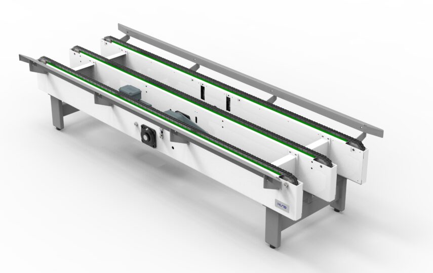 - Saadaval on 2 või 3 ketikäiguga konveier (üle 800 kg kaaluvatele alustele soovitatakse 3 ketti). Igal ketijooksul kasutatakse sirgete lülidega kaherealist täppisketti.